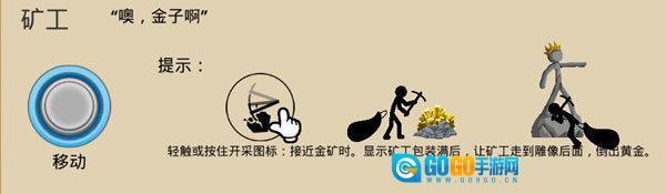 矿工:当靠近金矿时,轻触或按住开采图标进行开采。等矿工的背包显示装满后,引导矿工走到雕像后方,将黄金倒出,这样就完成收集了。
