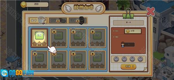 4、选择关卡1,开启店铺经营