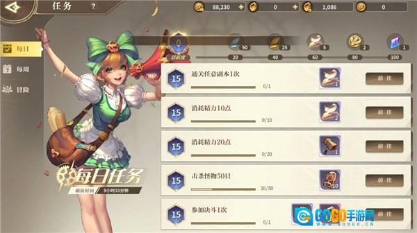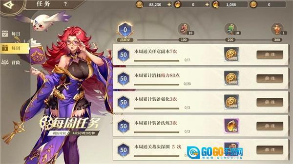 每周一刷新,完成获得道具奖励和活跃度,解锁更多奖励。