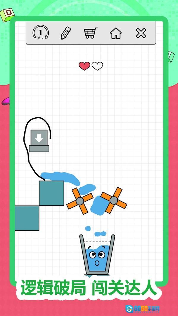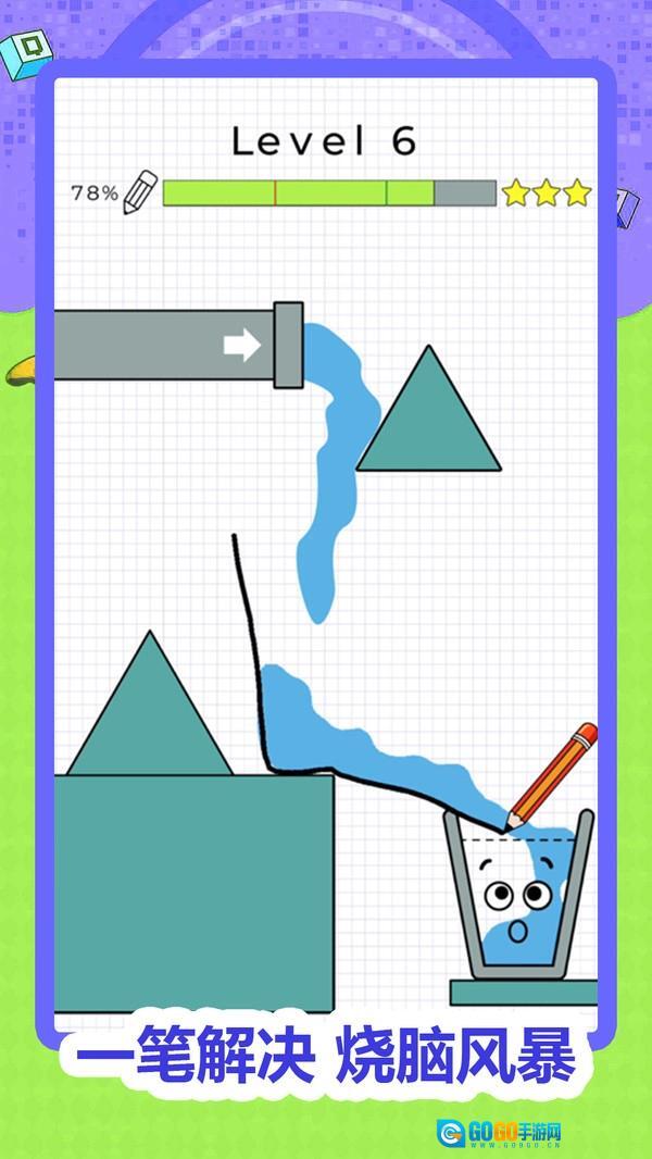 1、点击屏幕任意地方可以绘制线条,根据关卡设定,让水顺利流到杯子即可。