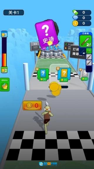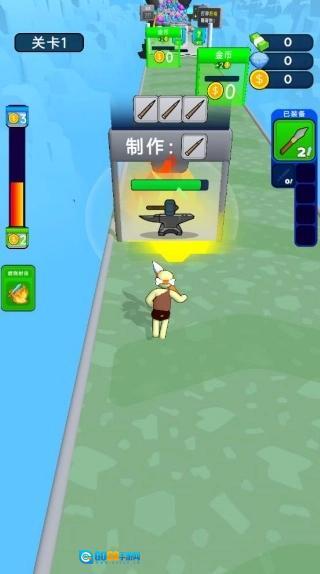 1、控制角色一直向前,用武器向着前面的物体射击,获取到收益。