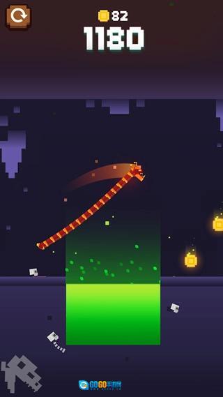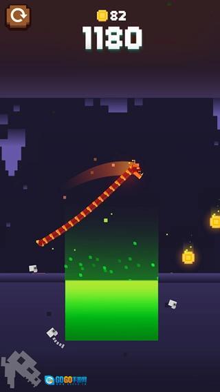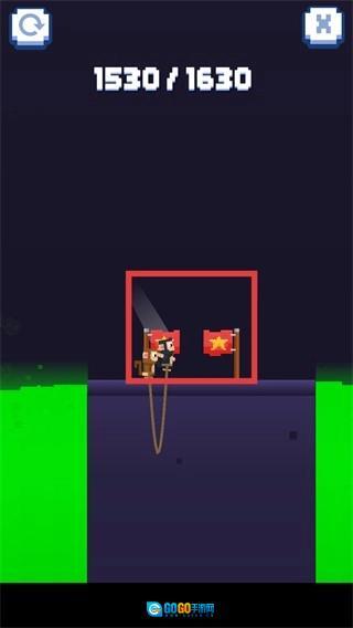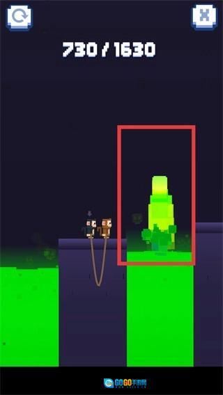2、操控猴子利用绳索在平台之间移动,要留意避开绿色的危险物品。