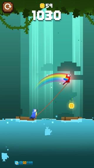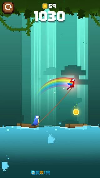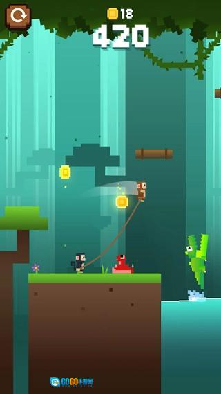 在游戏中,玩家将以最初的两个猴子角色为主角,通过相互拉动来跳跃。每次跳跃的距离将由玩家的屏幕控制时间决定。