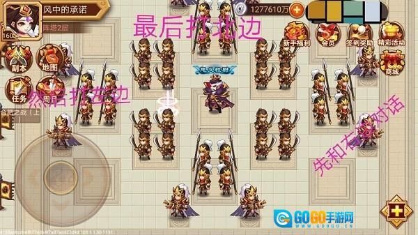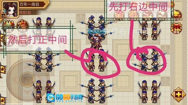 在兵阵塔的第四层,有一个名为棋阵的关卡,破阵的提示语是“双車见佳人”。我在这一层的棋艺表现不佳,打算日后找策划好好探讨一番。这里需要注意的是,只需攻击一百级的目标,而一千级的目标都是错误的,一旦遇到应立即撤退,按照图示顺序进行攻击即可。