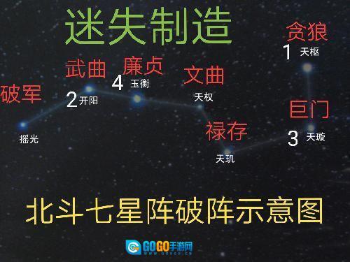 北斗七星各有对应的星宫与星君名号,从第一星到第七星依次为天枢贪狼、天璇巨门、天玑禄存、天权文曲、玉衡廉贞、开阳武曲、摇光破军。若要破除此阵,需留意每颗星对应的星宫名号,从中找出提示所指的四位星君,便能完成破阵,具体可参照图示。