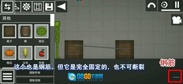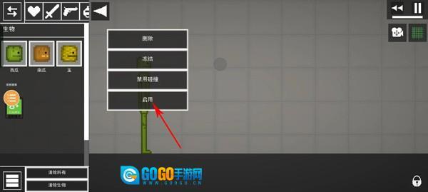 先把胳膊抬起来,接着双击西瓜角色的胳膊,此时会弹出删除、冻结、静置碰撞、启用这些选项,选择“冻结”后,胳膊就会保持静止状态。