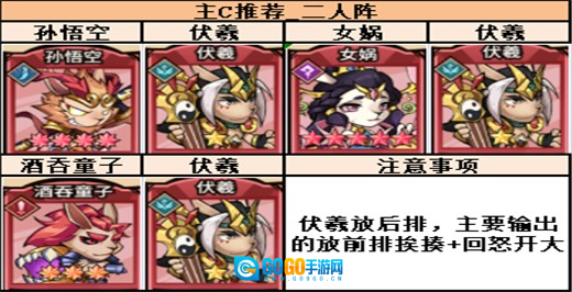 首先要是用两只兔将推图,推荐搭配“孙悟空+伏羲”“女娲+伏羲”“酒吞童子+伏羲”,需要注意伏羲得放在后排,主要承担输出任务的兔将要放在前排,这样既能抗伤害,又能回怒放大招。