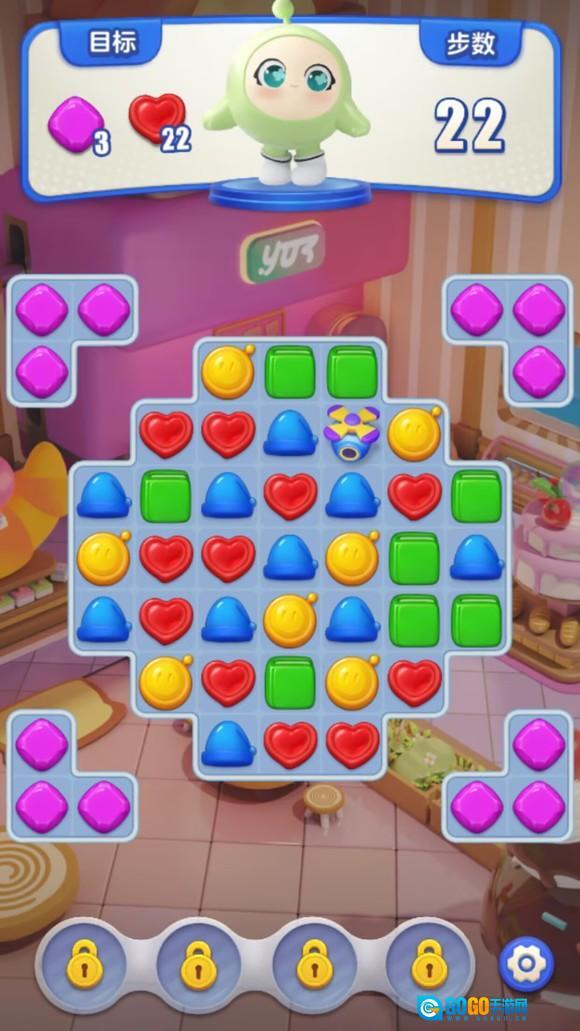 第四关需要收集五颗紫色宝石和二十五颗红色小爱心才能达成目标。