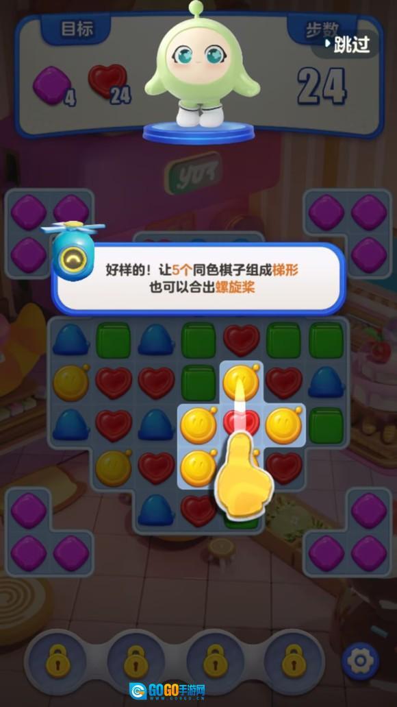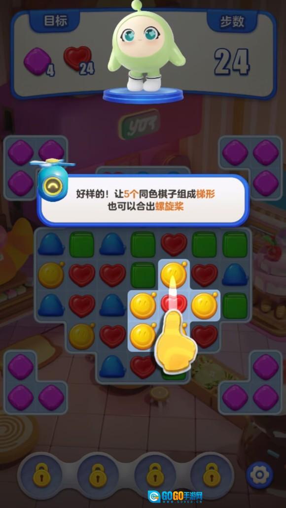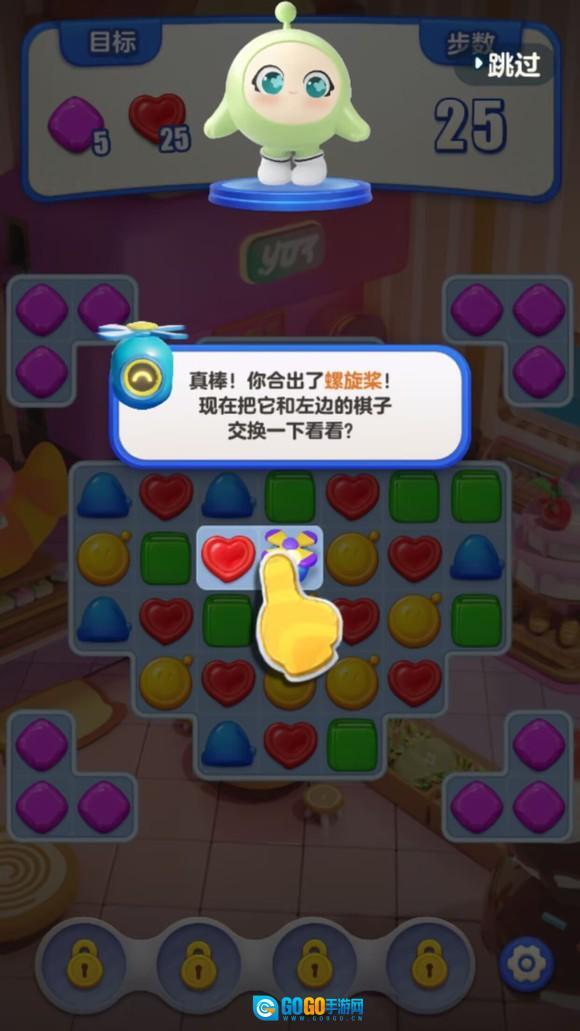 继续进行下一步操作,当5个相同颜色的棋子组成梯形时,同样能够合成螺旋桨。合成完成后,点击螺旋桨即可使其起飞,和上一步的操作方式一致,螺旋桨起飞后还能再次消除一颗紫色宝石。