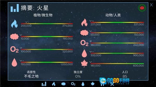 对行星进行地球化改造,调整每个星球的专属特性以适配人类生存,这些特性涵盖气压、氧气含量、海平面高度以及生物质等关键要素。