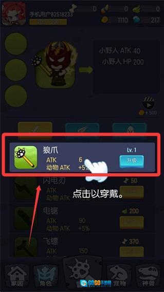 在界面底部的角色系统中,能够为小野人配备各类装备,只需点击相应装备就能完成穿戴操作,而小野人当前的各项状态信息则会显示在界面的上半部分区域。