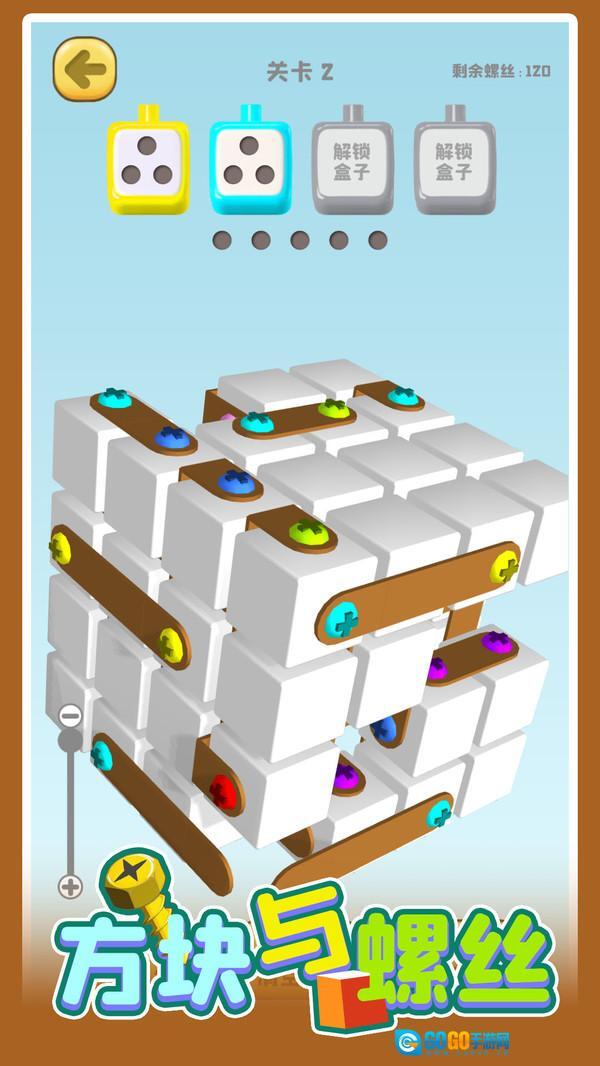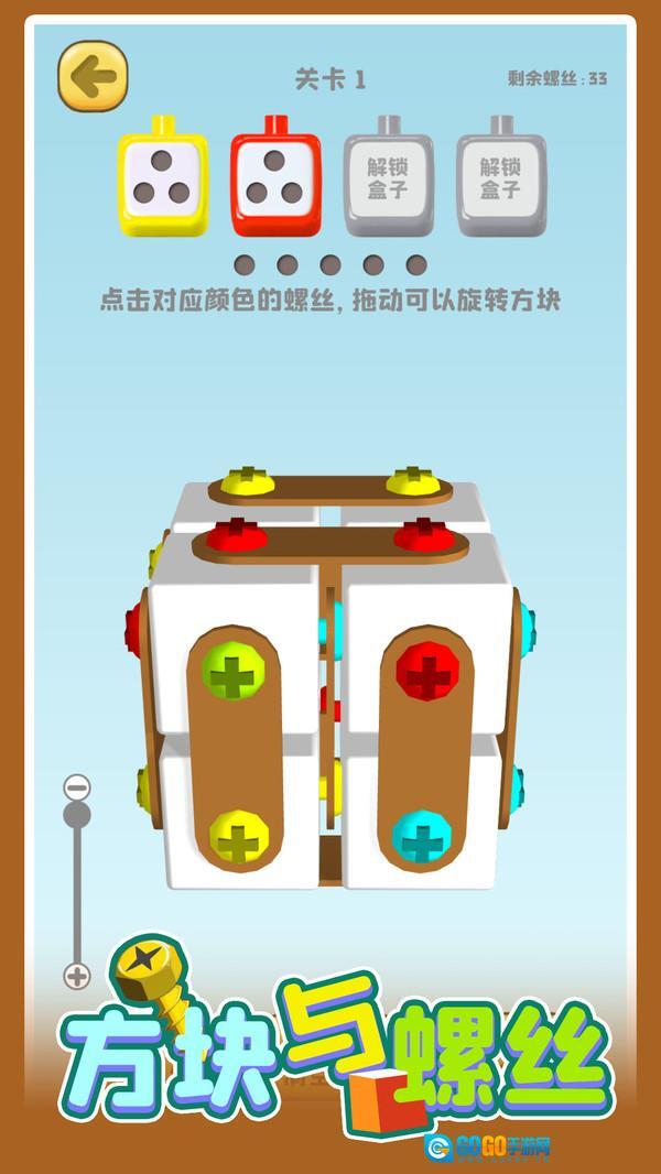 先留意上方面板所提示的色彩要求,再点击方块上与之匹配的彩色螺丝,接着通过拖拽操作转动方块以调整到合适的角度。