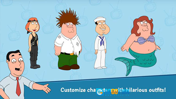 游戏进行时,玩家还能解锁不少趣味服装来装扮自己的角色,比如美人鱼造型的彼得、身着比基尼的Quagmire、兰博风格的洛伊丝等等;