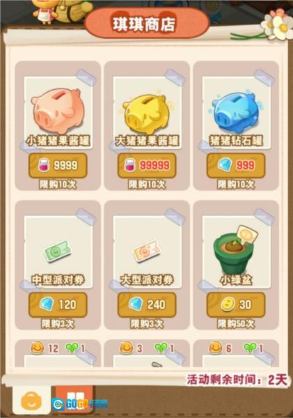 琪琪商店的核心亮点是小猪储蓄罐,其实质是间接提升果酱上限——每天有三次用果酱兑换盲盒十连抽的机会,那些一周忙五天的朋友,能趁空闲攒果酱换小猪,还能通过堆叠地图让储蓄罐转化为气泡。