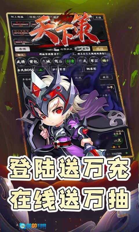 《天下策》是以三国为时代背景打造的文字MUD游戏,它将卡牌养成与策略搭配的玩法巧妙结合。玩家在游戏里能够招募三国时期的著名将领,通过对武将进行全方位的培养来提升他们的实力,从而一步步实现建立千秋霸业的目标。这款游戏的操作方式简单易懂,很容易就能上手,并且支持玩家随时随地进行游戏,让大家可以轻松地领略到一个别具一格的三国世界。游戏中还有着丰富多样的玩法,比如主城建设、历练挑战、副本探索、跨服争霸以及军团等内容,为玩家带来了多种多样的策略乐趣,让玩家能够感受到三国乱世之中的激情与谋略!