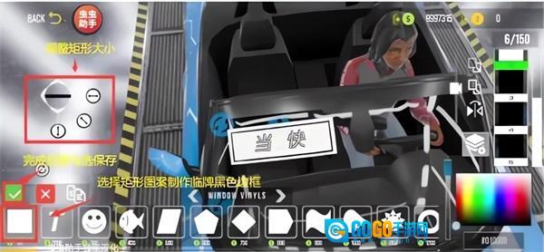 点击向左或向右按钮都可以,直到选中“WINDOWVINYLS”(车窗贴纸),选定第一个矩形图案后,调整好大小与位置,再点击“√”完成保存。