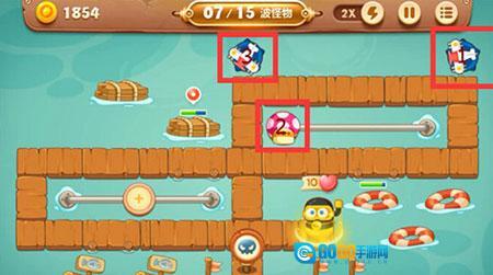 我们要守护糖果车不被怪物啃食,收集到的糖果车数量越多,对应的加分就会越高。对于糖果车而言,最头疼的就是飞行怪了!飞行怪移动速度快,能迅速追上糖果车。但飞行怪的生命值比其他怪物要低一些,所以我们得布置减速炮塔,降低飞行怪的移动速度,这样其他炮塔就能有更充足的攻击时间,尽快将飞行怪消灭掉。