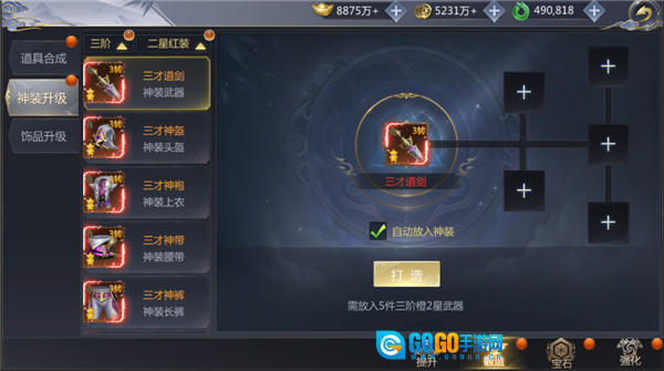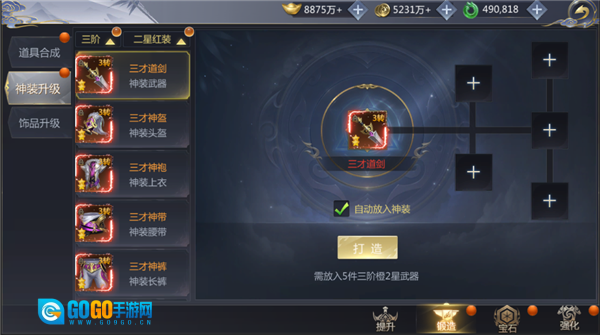在装备打造系统中,玩家能够制作各阶段的红色二星与红色三星装备。制作红色二星装备时,需集齐五件同阶段的橙色二星装备作为材料;而制作红色三星装备,则要准备五件同阶段的红色二星装备。整个装备打造过程不会产生金币消耗。