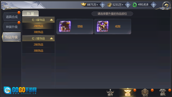 界面支持打造2~3转红2星、红3星饰品。其中,打造红2星饰品需消耗3件对应阶段的橙2星装备;打造红3星饰品则需消耗3件对应阶段的红2星饰品。