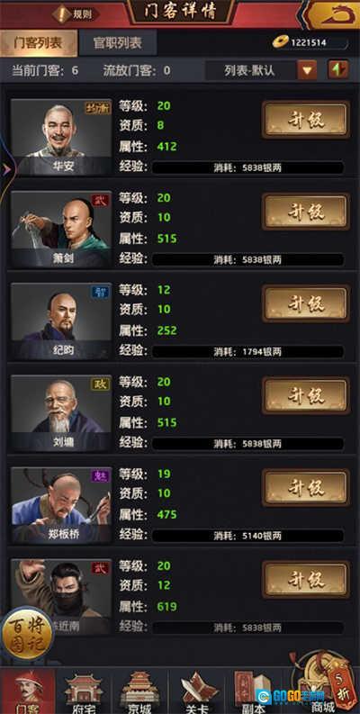 每个门客等级包含人物等级、书籍等级和技能等级这三大项。人物等级提升会带来四项属性的增长,而且人物必须达到60级才能参与衙门PK。