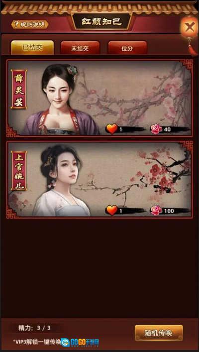 关于红颜系统的一些建议:首先,除了VIP专属的特殊红颜外,其他红颜角色都会随着游戏进程逐步解锁,所以不用纠结初始阶段拥有的数量。