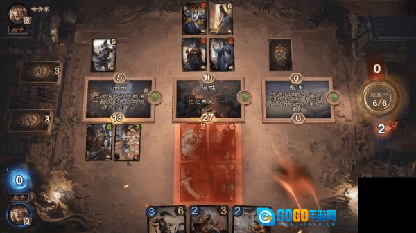 4. 对局时下方是手牌区,每回合从自己的卡组里摸一张牌,手牌区最多能保留7张手牌。每个回合放置到战场的武将,其粮草消耗总和不能超过当前回合的粮草数量。武将放到战场后,点击右侧的结束回合按钮。先手玩家(左边头像旁会显示“先手”标识,对应的是后手玩家)先亮出武将,随后后手玩家再亮。对局过程中,长按战场右上方的勾玉,可对该战场进行加倍操作;加倍后,该战场的勾玉会变为2个。若对方也在这个战场进行加倍,勾玉则会变为4个。