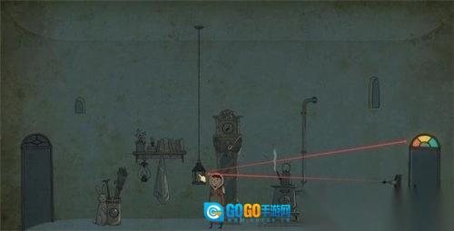 拉动右侧墙体上摇杆使房间内的吊灯下落,熄灭吊灯可获得线索。