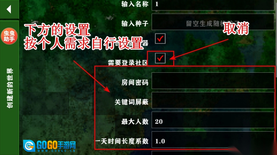 4. 记得取消勾选需要登录社区的选项,并设置好房间的类型与需求。