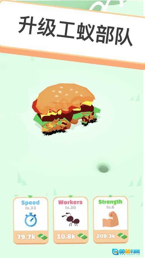 这时大家能看到有蚂蚁陆陆续续地进行搬运,速度太慢了该怎么办呢?可以点击下方,使用金币召唤更厉害的蚂蚁来帮忙。