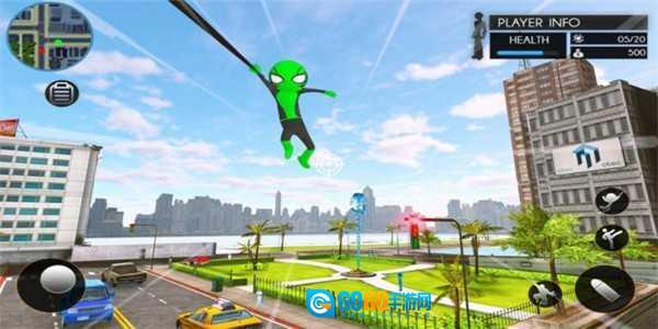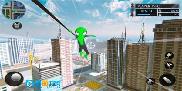 游戏的操作方式很简单,玩家只需通过摇杆选定城市里的楼顶,再借助勾爪就能快速飞驰移动。