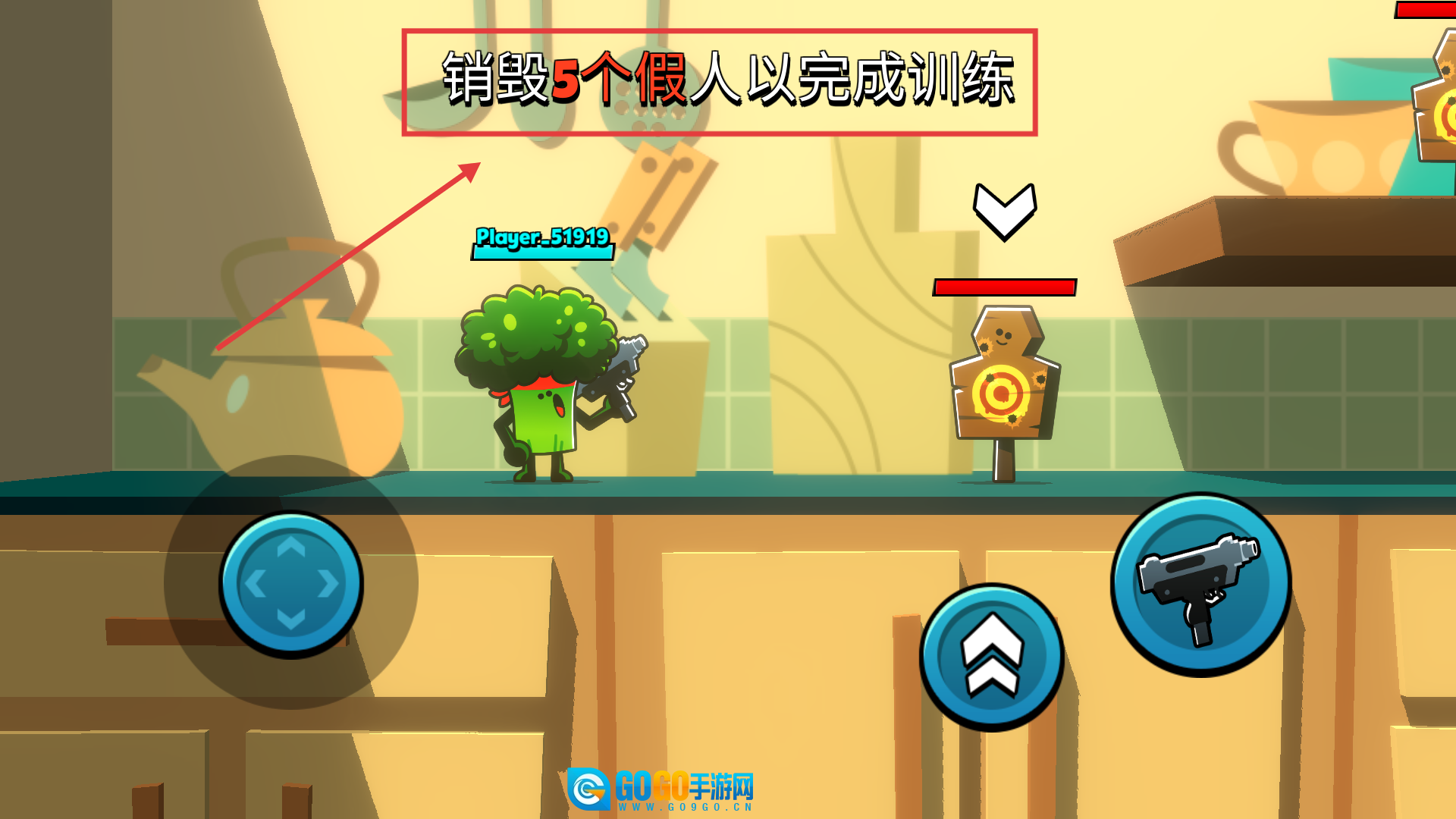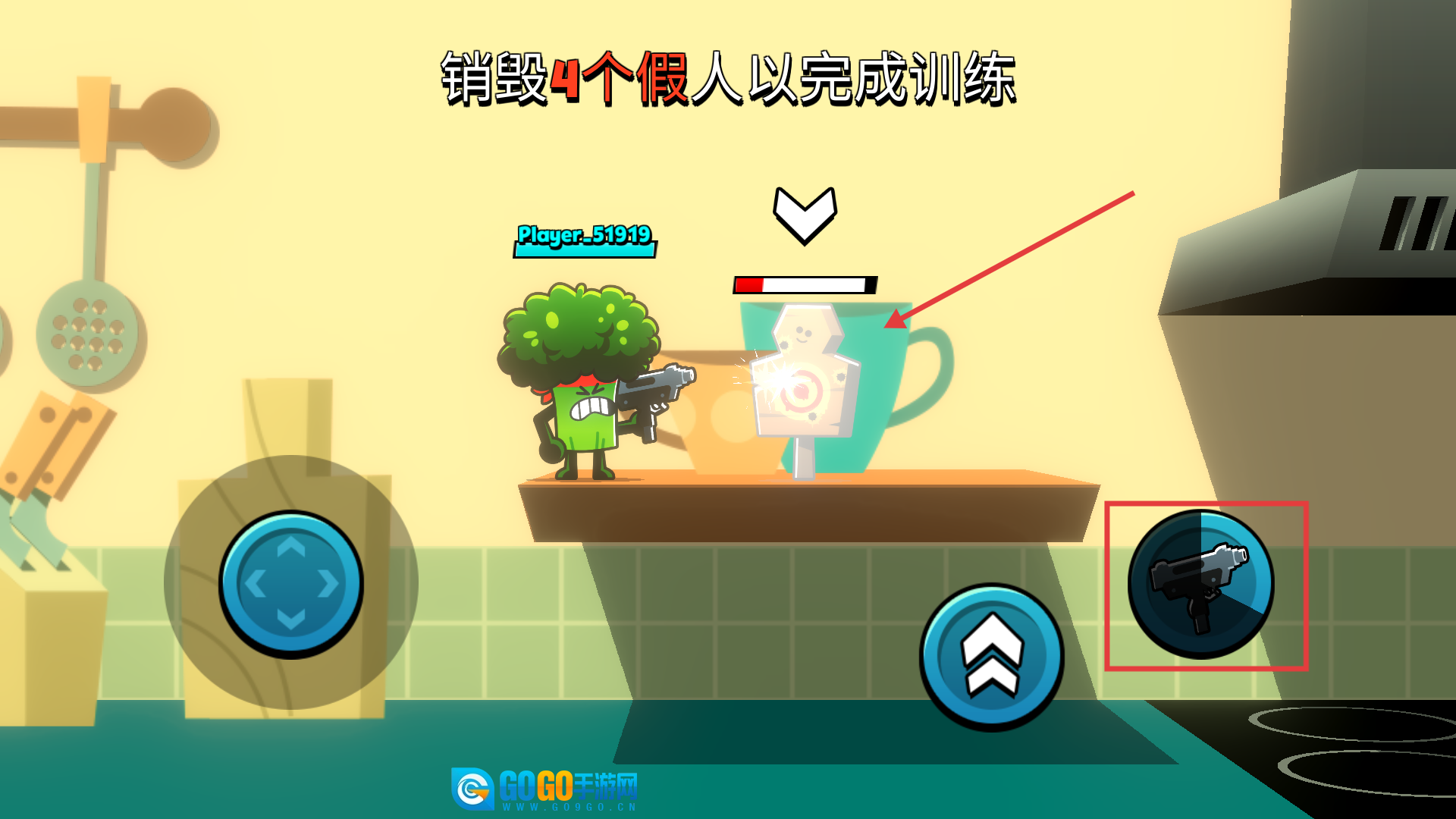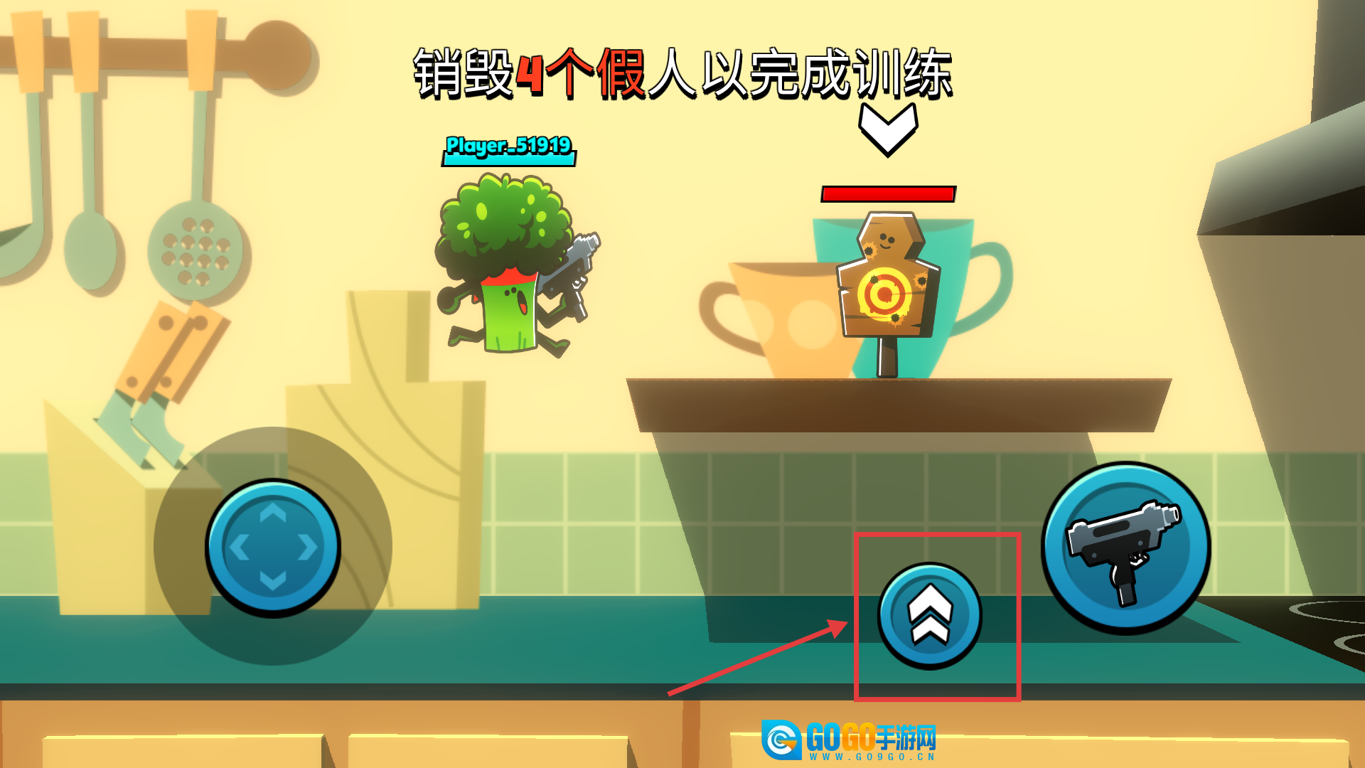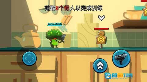 1、通过虚拟摇杆操控角色移动调整站位,配合跳跃与射击按键,利用厨房内的地形特点对对手发动致命攻击。