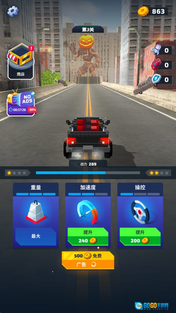 2、除了撞击这种方式外,我们还能够收集各类武器,像火箭弹、巨型炸弹之类的都可以,把它们装载到汽车上,就能对敌人发起毁灭性的打击。