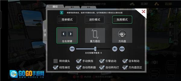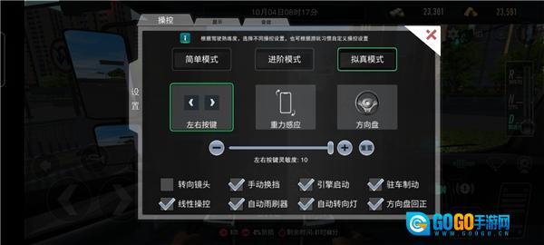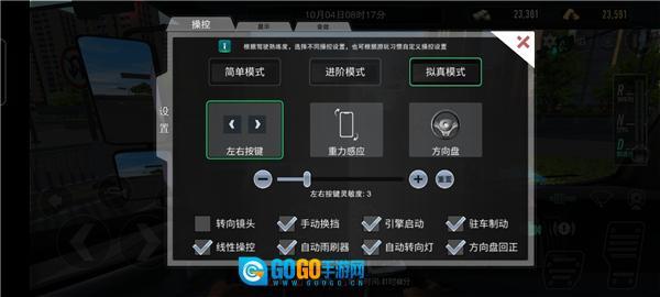 拟真模式的默认配置如下:方向盘操控、转向镜头、手动换挡、引擎启动、驻车制动、线性操控、自动雨刷、自动大灯、方向盘回正。