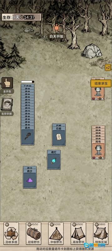 生存总时长为50天,期间每10天会出现一次BOSS级别的诡异入侵事件,成功挑战后能获取丰厚资源;而在其他非特殊日期的夜晚,击败入侵的怪物则有机会得到稀有材料与装备。