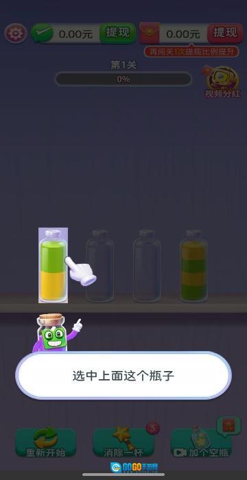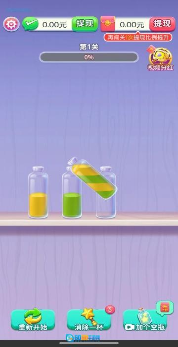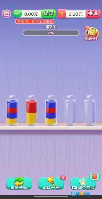 1、操作极为简单直观,只需轻点选中瓶子,再点击目标瓶子就能完成倾倒动作,液体流动时伴有丝滑的动画效果和清脆的音效,体验感很不错。