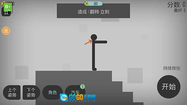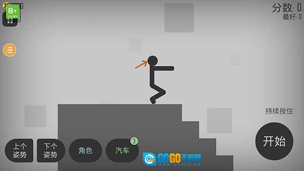 为了更顺利地完成关卡任务,我们得点击左下角的按钮,以此来调整火柴人的姿态以及箭头所指向的受力位置。