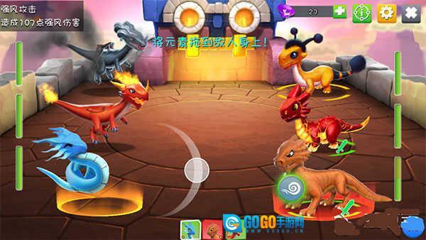 滑动元素到目标龙身上查看伤害效果,合理分配攻击以减少损失。