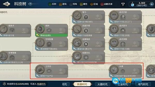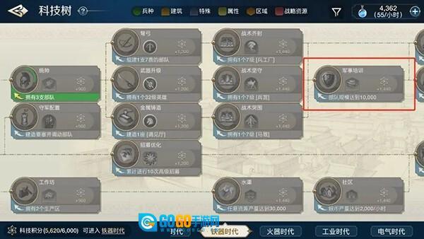 首要目标:进入铁器时代,开展“军事培训”的研究,解锁皇家学堂以提升英雄的带兵容量。