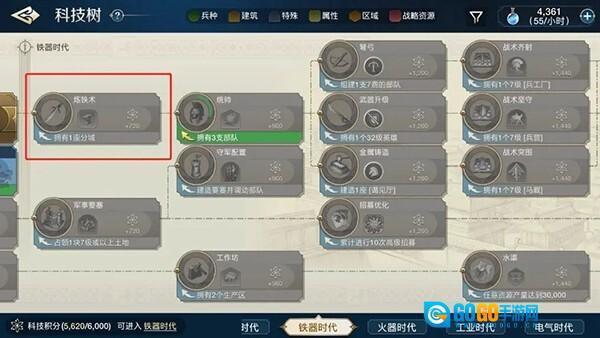 优先解锁炼铁术相关的科技,加快开启军事培训的进程。增强军队的实力,随后持续率领军队拓展领土以获取资源。