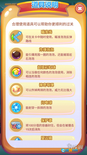 当遇到无法消除的泡泡时,你可以借助道具来辅助消除,详细的使用说明请查看游戏内的相关提示。