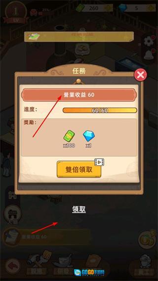 完成任务后,就可以领取金币、钻石之类的奖励,以此为店铺的发展积累所需资源。