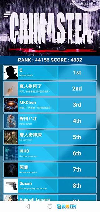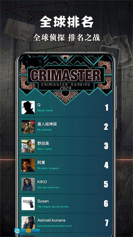 这里基本还原了《唐人街探案》里的侦探排行榜,榜一就是大家熟悉的Q,但传闻说这只是个账号而非真人,具体情况如何crimaster方面并没有给出回应。不过根据我的观察,榜二和榜三应该都是真实玩家。至于其他玩家ID,像“唐人街侦探”“阿默(林默?)”这些唐探宇宙里的知名侦探角色,到底是真人在玩还是官方账号,目前也没人能确定。不过在这里,你能清楚看到自己的实时排位。 PS:随着玩家数量增多,刷分的情况也不少见,这导致排位会很不稳定——尤其是中下游分数段(大概5000分以后的玩家)。所以想冲进靠前的榜位难度不小,对新手来说更是挑战。