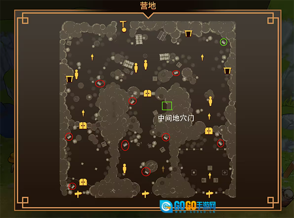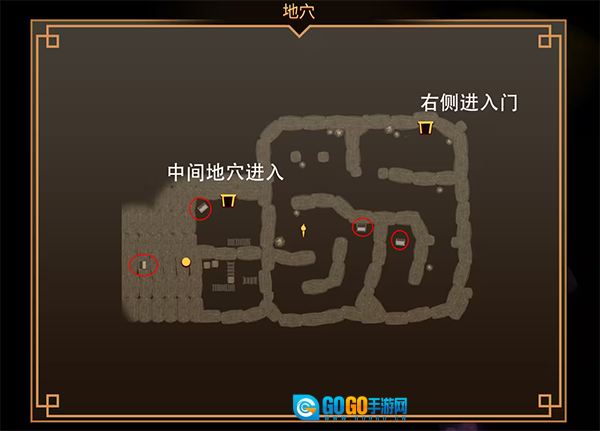 从营地右侧的地穴门进入,对应的就是图中标注的“右侧进入门”;另外,穿过中间地穴也能进入此区域,开启左侧的两个宝箱。