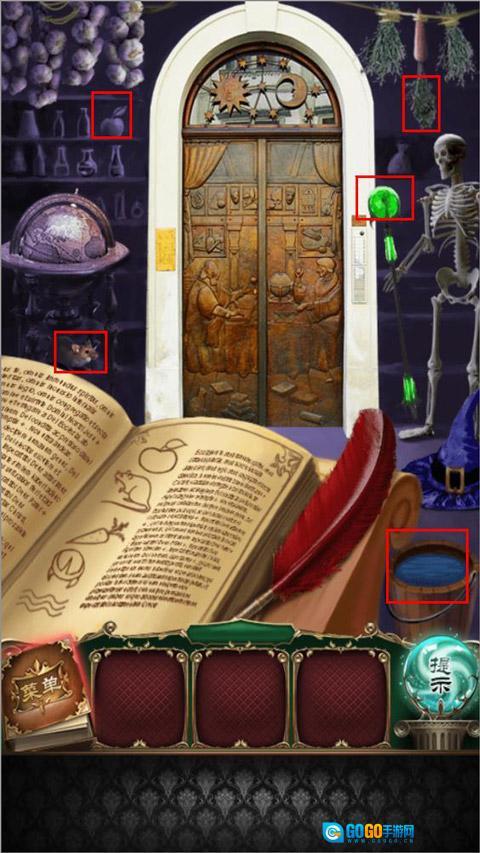 第六关是寻物关卡。首先在左侧架子上找到一颗苹果,接着在下方获取一只老鼠,然后到右边拿到胡萝卜和骷髅上的宝石,最后点击水,门就会打开,这样就能进入第七关了。