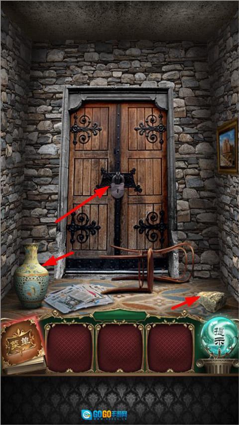 到了第二关就没有提示了,我们得先捡起右边的石头,用它打碎左边的花瓶,这样就能拿到钥匙,再用钥匙打开大门,就能进入第三关了。