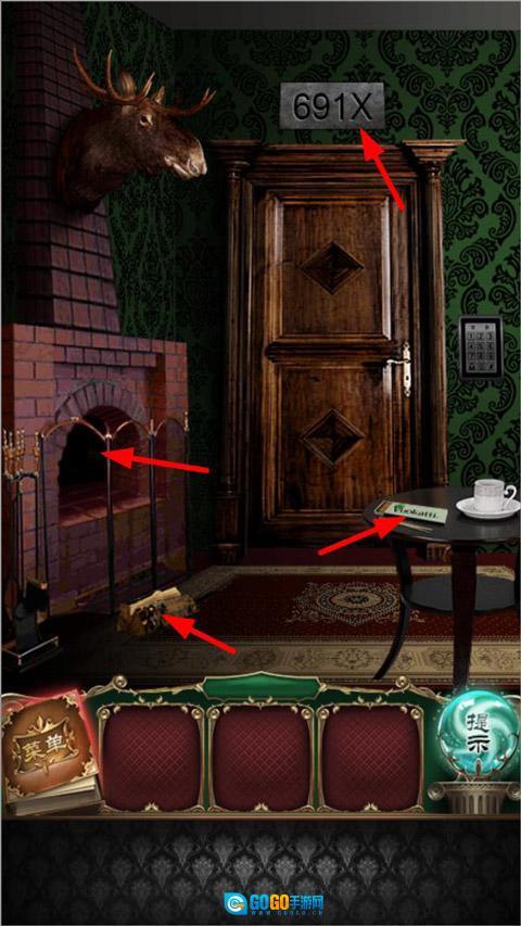 来到第四关,首先要去左边的火炉那里取木柴,接着到右边的桌子上拿火柴。之后把木柴放进左边的火炉里,再用火柴将其点燃。这时能看到火炉壁上显示着数字4,而对应的密码是6914,输入密码打开门,就能进入第五关了。