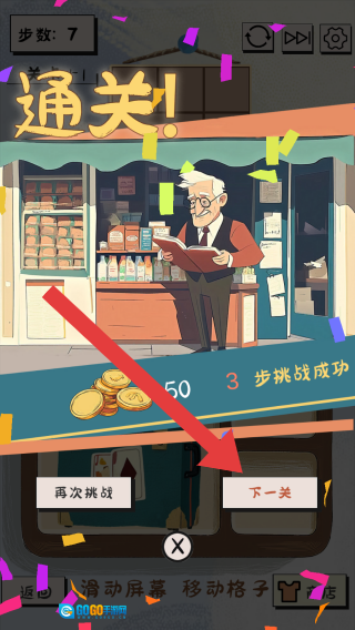 游戏界面呈现出“通关”字样,显示步数为7,标注“3步挑战成功”,同时设有“再次挑战”与“下一关”两个按钮;游戏场景设定在杂货铺,还有一位老人角色。