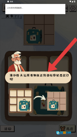 玩法提示文字:滑动格子,让所有物体达到目标图状态即可,此外还有返回、商店等按钮,展现的是通过滑动格子达成目标状态的解谜玩法场景。
