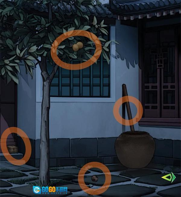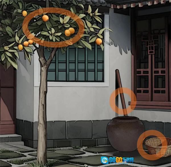 别雅园:进去后先往左边走,捡起地上的钩耙、烂枇杷,还有左下角的砝码,接着用钩耙去够树上的枇杷,这样就能得到枇杷了。