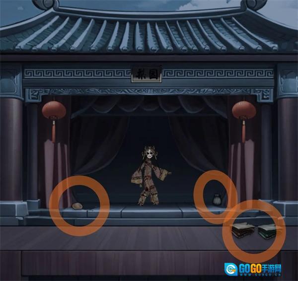 往右边走(前方有小高能突脸,大家注意!!!),记得拿戏台两侧的东西——茶包和胭脂,台子上还放着红、绿两件戏服(这些戏服的选择和文思堂里鬼脸的颜色有关联,但试了好几回发现应该是纯随机的,直接凭感觉选一件穿上就行)